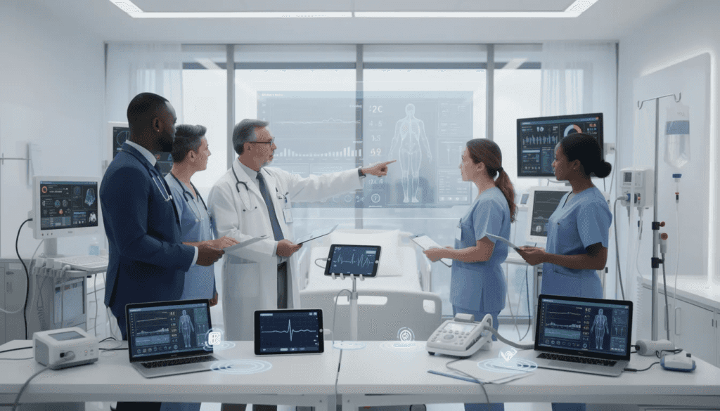 Hospital-Based Device Integration: • Bedside monitor integration with automatic vital sign documentation and alert generation • Infusion pump data capture for medication administration tracking and safety monitoring • Ventilator and respiratory device data for intensive care monitoring and outcome prediction • Surgical instrument tracking and sterilization verification for infection prevention